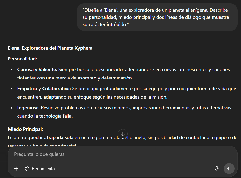 “Diseña a ‘Elena’, una exploradora de un planeta alienígena. Describe su personalidad, miedo principal y dos líneas de diálogo que muestre su carácter intrépido.”