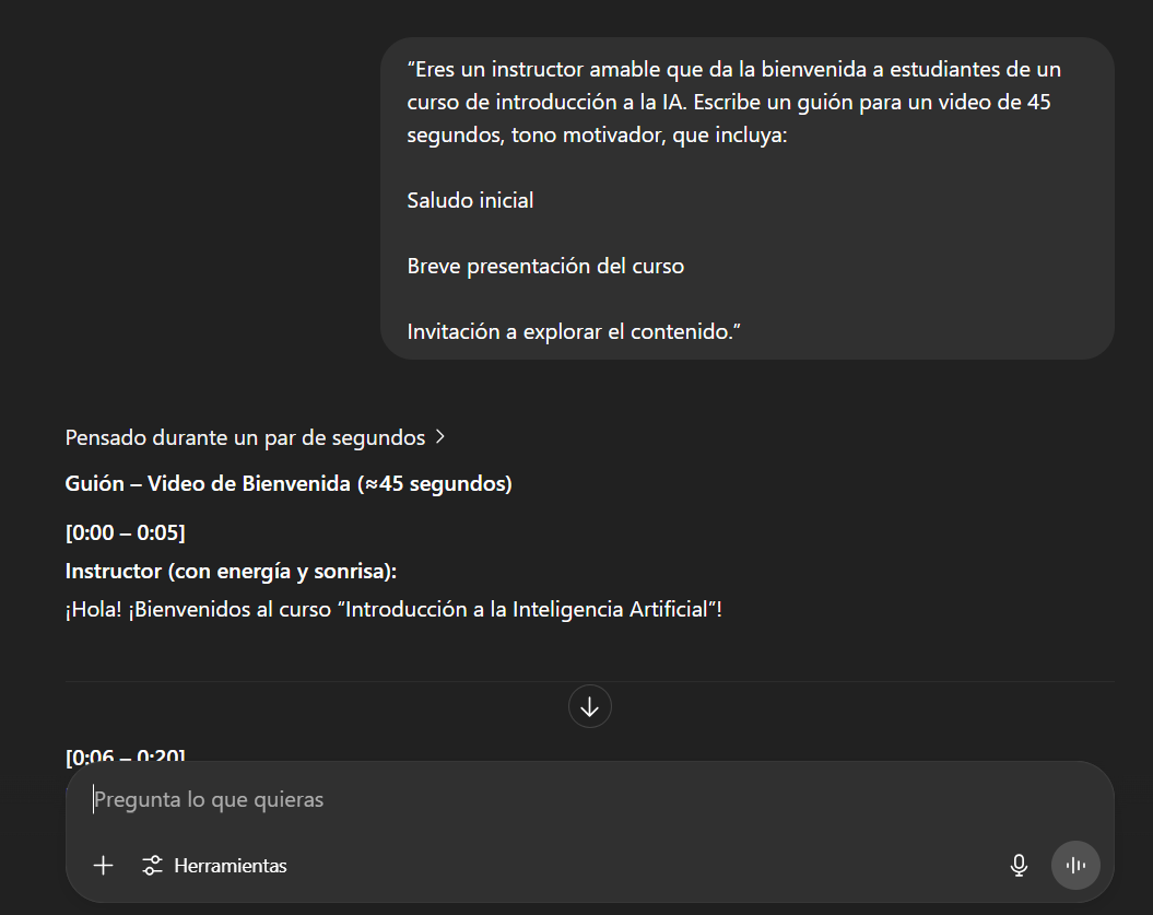 “Eres un instructor amable que da la bienvenida a estudiantes de un curso de introducción a la IA. Escribe un guión para un video de 45 segundos, tono motivador, que incluya: