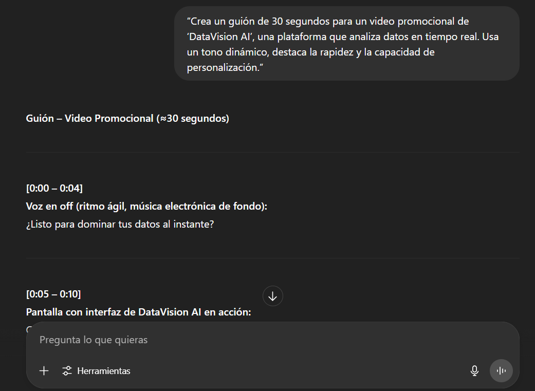 “Crea un guión de 30 segundos para un video promocional de ‘DataVision AI’, una plataforma que analiza datos en tiempo real. Usa un tono dinámico, destaca la rapidez y la capacidad de personalización.”